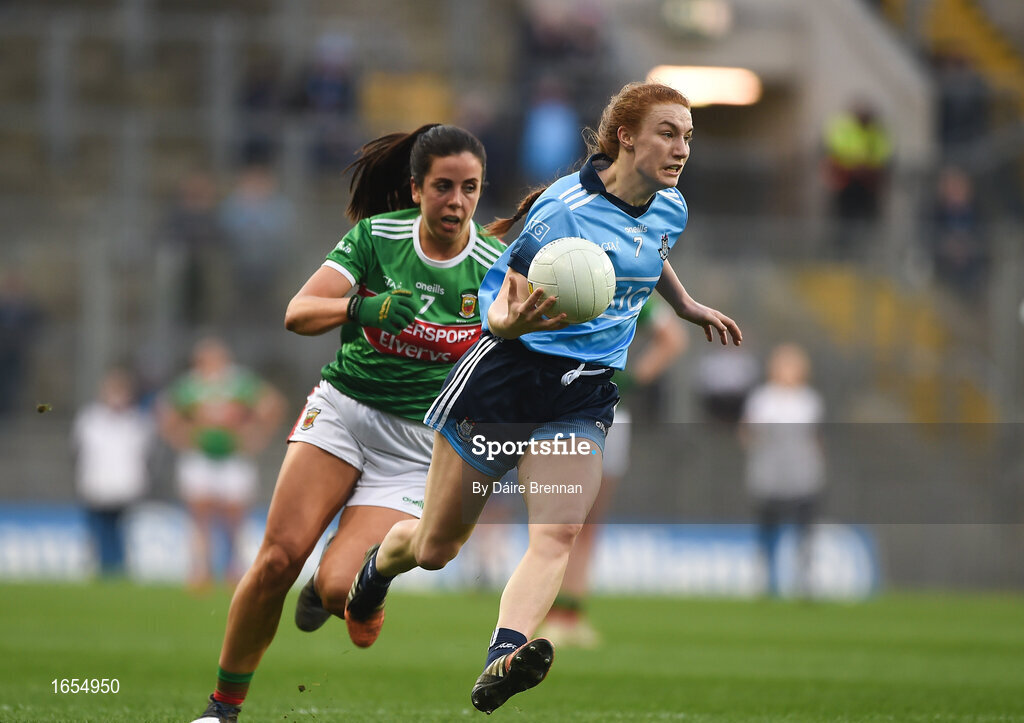 23 February 2019; Lauren Magee of Dublin in action against Nóirín Moran of Mayo during the Lidl Ladies NFL Division 1 Round 3 match between Dublin and Mayo at Croke Park in Dublin. Photo by Daire Brennan/Sportsfile