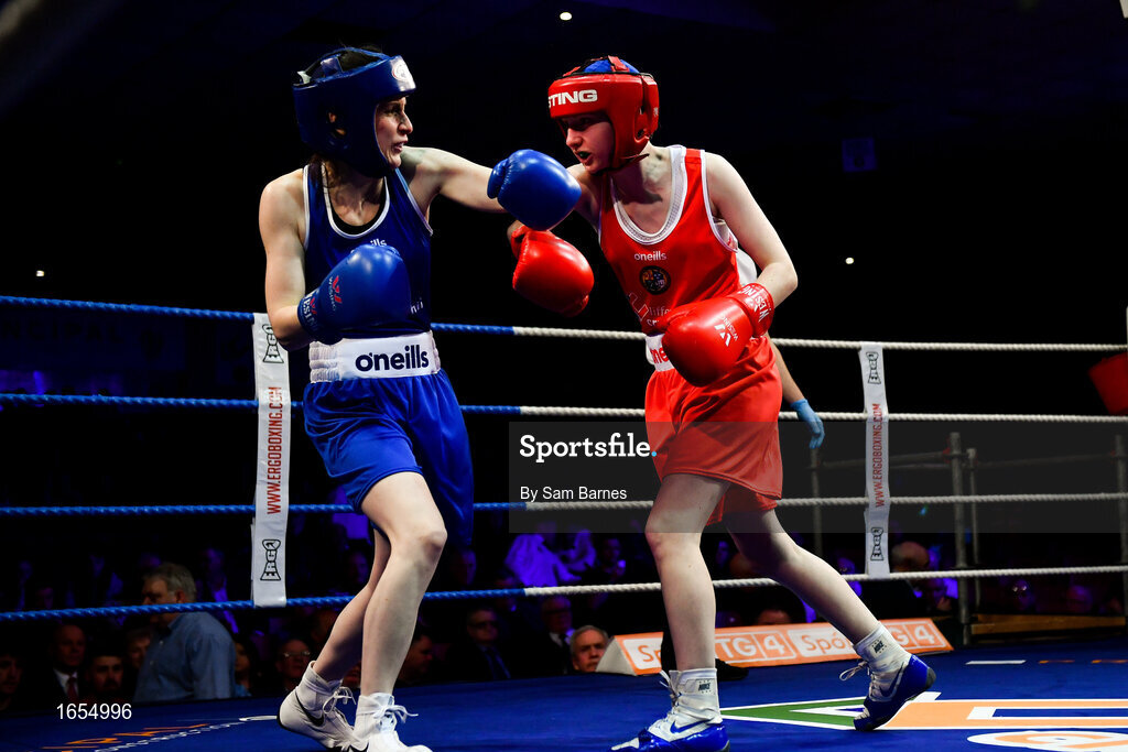 23 February 2019; Chloe Fleck, right, in action against Donna Barr during their 48kg bout at the 2019 National Elite Men’s & Women’s Boxing Championships Finals at the National Stadium in Dublin. Photo by Sam Barnes/Sportsfile