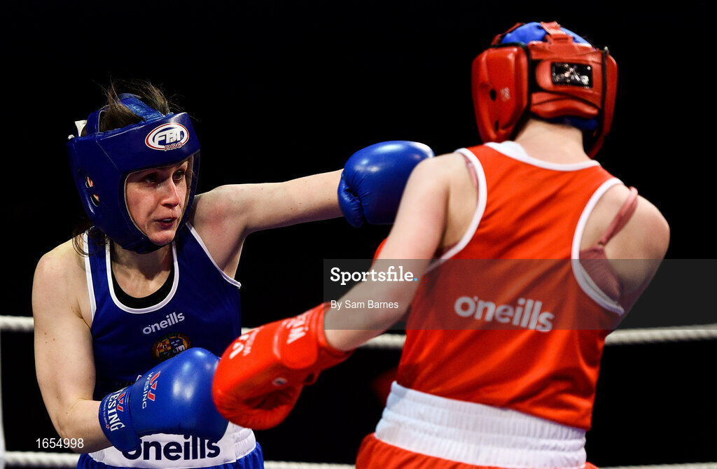 23 February 2019; Donna Barr, left, in action against Chloe Fleck during their 48kg bout at the 2019 National Elite Men’s & Women’s Boxing Championships Finals at the National Stadium in Dublin. Photo by Sam Barnes/Sportsfile