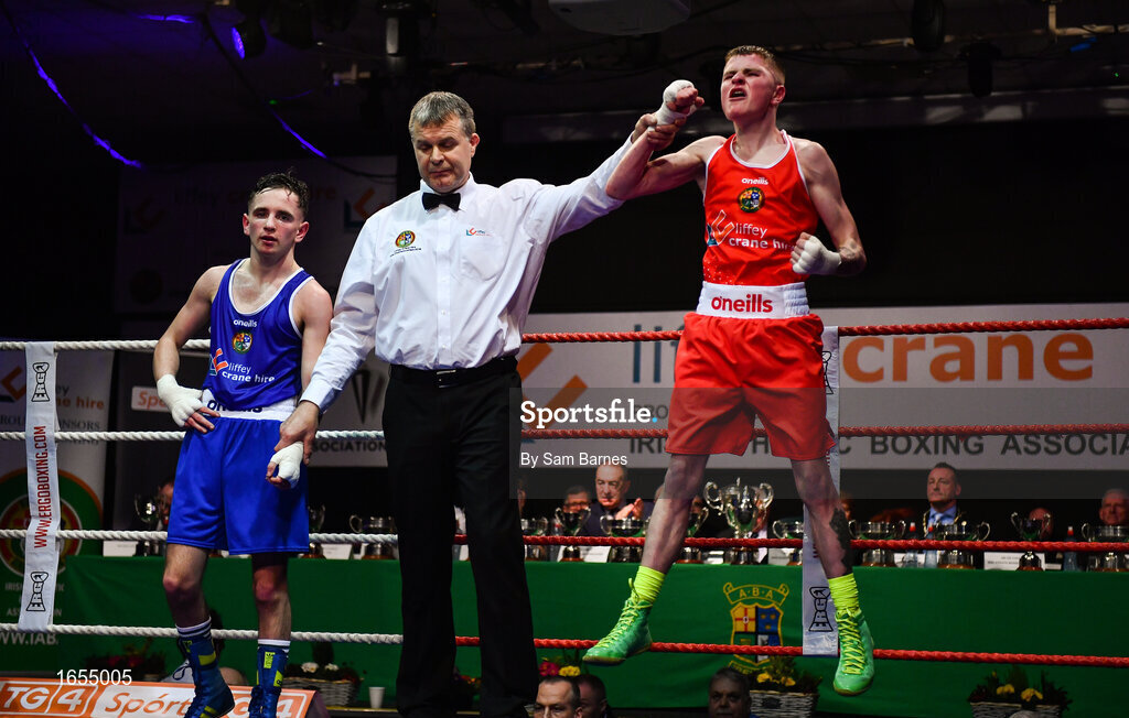 23 February 2019; Regan Buckley celebrates after being declared winner over Sean Mari in their 49kg bout at the 2019 National Elite Men’s & Women’s Boxing Championships Finals at the National Stadium in Dublin. Photo by Sam Barnes/Sportsfile