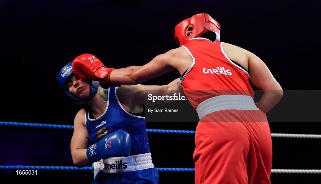 23 February 2019; Cheyanne O'Neill, left, in action against Aoife O'Rourke during their 75kg bout at the 2019 National Elite Men’s & Women’s Boxing Championships Finalss at the National Stadium in Dublin. Photo by Sam Barnes/Sportsfile