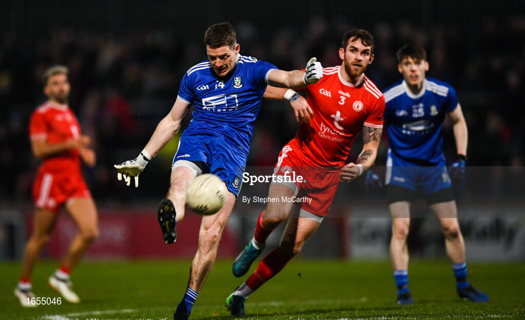 23 February 2019; Dermot Malone of Monaghan kicks a point despite Ronan McNamee of Tyrone during the Allianz Football League Division 1 Round 4 match between Tyrone and Monaghan at Healy Park in Omagh, Co Tyrone. Photo by Stephen McCarthy/Sportsfile