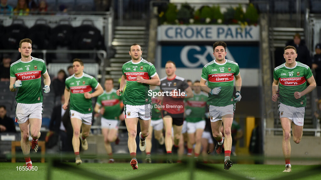 23 February 2019; Mayo captain Keith Higgins leads his side out ahead of the Allianz Football League Division 1 Round 4 match between Dublin and Mayo at Croke Park in Dublin. Photo by Daire Brennan/Sportsfile