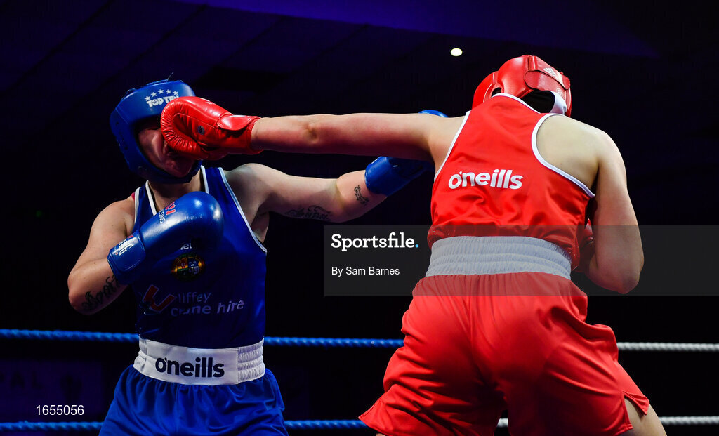 23 February 2019; Cheyanne O'Neill, left, in action against Aoife O'Rourke during their 75kg bout at the 2019 National Elite Men’s & Women’s Boxing Championships Finalss at the National Stadium in Dublin. Photo by Sam Barnes/Sportsfile