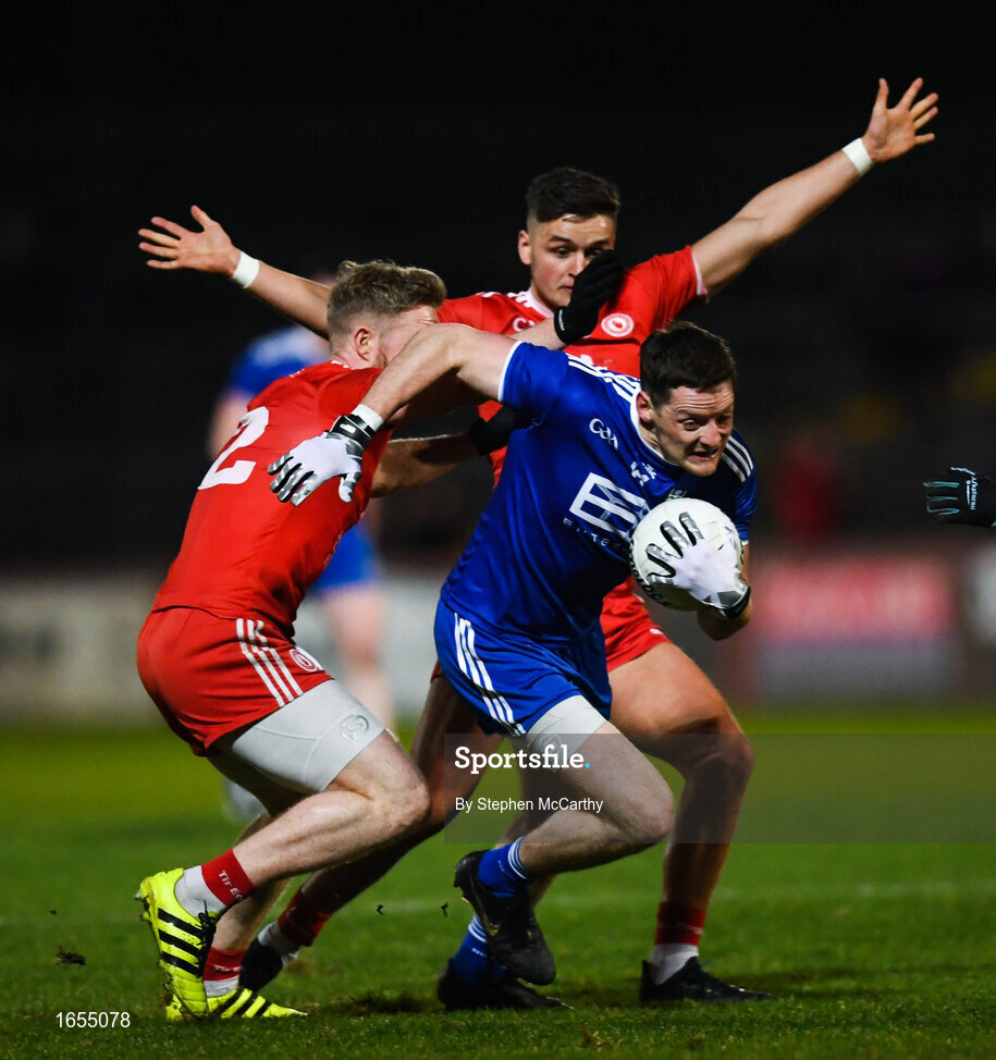 23 February 2019; Conor McManus of Monaghan in action against Frank Burns, left, and Michael McKernan of Tyrone during the Allianz Football League Division 1 Round 4 match between Tyrone and Monaghan at Healy Park in Omagh, Co Tyrone. Photo by Stephen McCarthy/Sportsfile