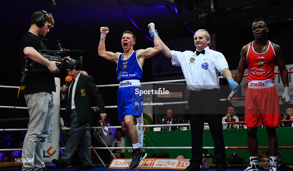 23 February 2019; Patryk Adamus, left, celebrates after being announced as winner against Christian Cekiso following their 57kg bout at the 2019 National Elite Men’s & Women’s Boxing Championships Finals at the National Stadium in Dublin. Photo by Sam Barnes/Sportsfile