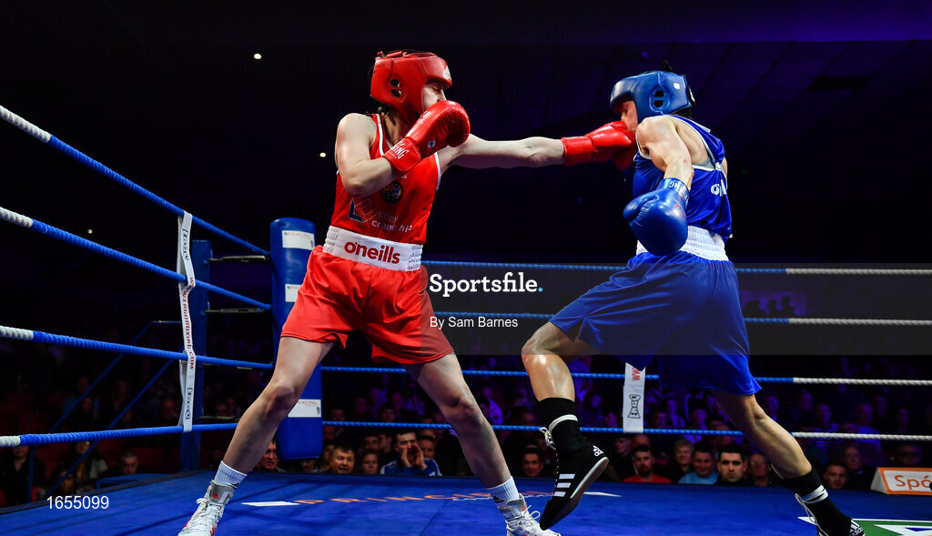 23 February 2019; Michaela Walsh, left, in action against Dearbhla Duffy during their 57kg bout at the 2019 National Elite Men’s & Women’s Boxing Championships Finals at the National Stadium in Dublin. Photo by Sam Barnes/Sportsfile