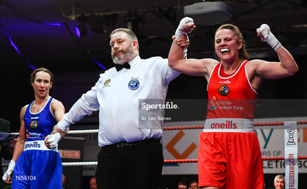 23 February 2019; Michaela Walsh, celebrates after being announced as the winner against Dearbhla Duffy following their 57kg bout at the 2019 National Elite Men’s & Women’s Boxing Championships Finals at the National Stadium in Dublin. Photo by Sam Barnes/Sportsfile