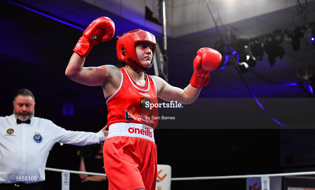 23 February 2019; Michaela Walsh, celebrates following her 57kg bout at the 2019 National Elite Men’s & Women’s Boxing Championships Finals at the National Stadium in Dublin. Photo by Sam Barnes/Sportsfile