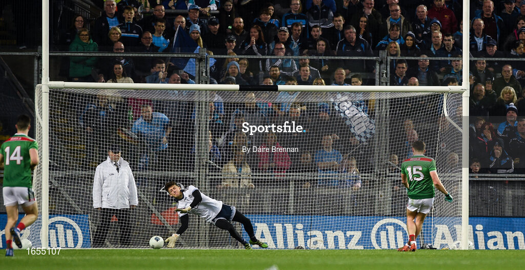 23 February 2019; Jason Doherty of Mayo has penalty saved by Evan Comerford of Dublin during the Allianz Football League Division 1 Round 4 match between Dublin and Mayo at Croke Park in Dublin. Photo by Daire Brennan/Sportsfile