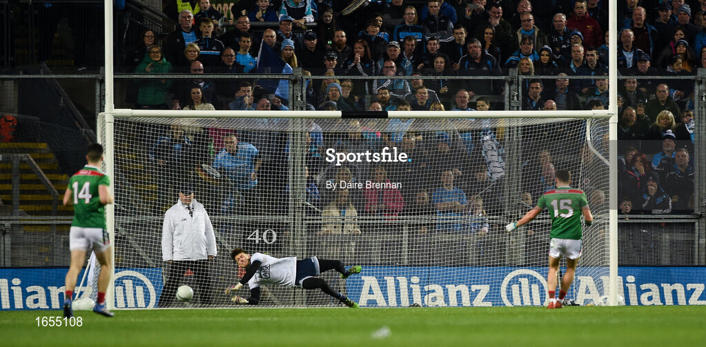 23 February 2019; Jason Doherty of Mayo has penalty saved by Evan Comerford of Dublin during the Allianz Football League Division 1 Round 4 match between Dublin and Mayo at Croke Park in Dublin. Photo by Daire Brennan/Sportsfile