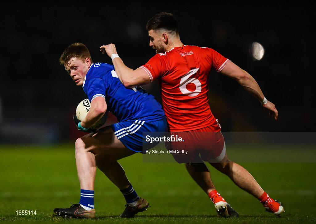 23 February 2019; Ryan McAnespie of Monaghan in action against Pádraig Hampsey of Tyrone during the Allianz Football League Division 1 Round 4 match between Tyrone and Monaghan at Healy Park in Omagh, Co Tyrone. Photo by Stephen McCarthy/Sportsfile