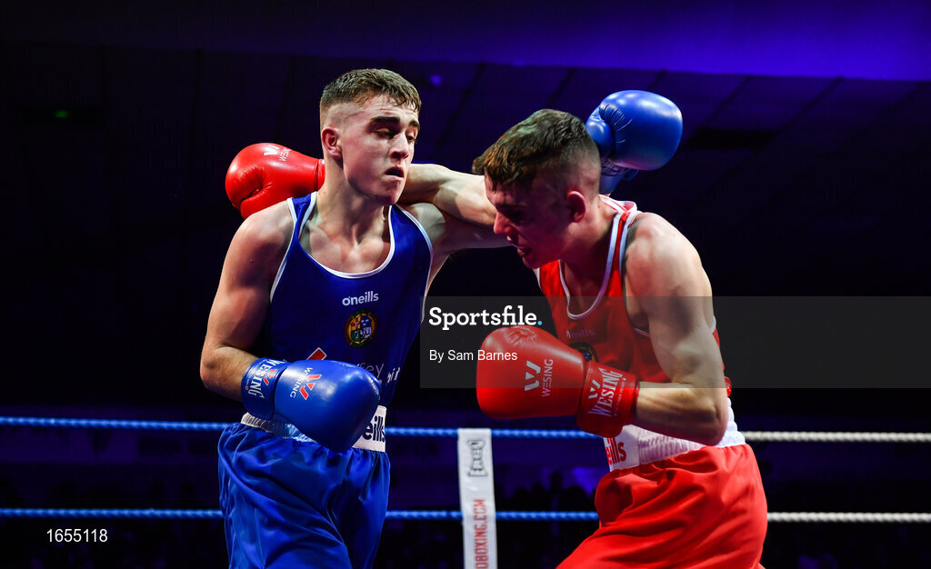 23 February 2019; David Oliver Joyce, left, in action against Dominic Bradley during their 60kg bout at the 2019 National Elite Men’s & Women’s Boxing Championships Finals at the National Stadium in Dublin. Photo by Sam Barnes/Sportsfile