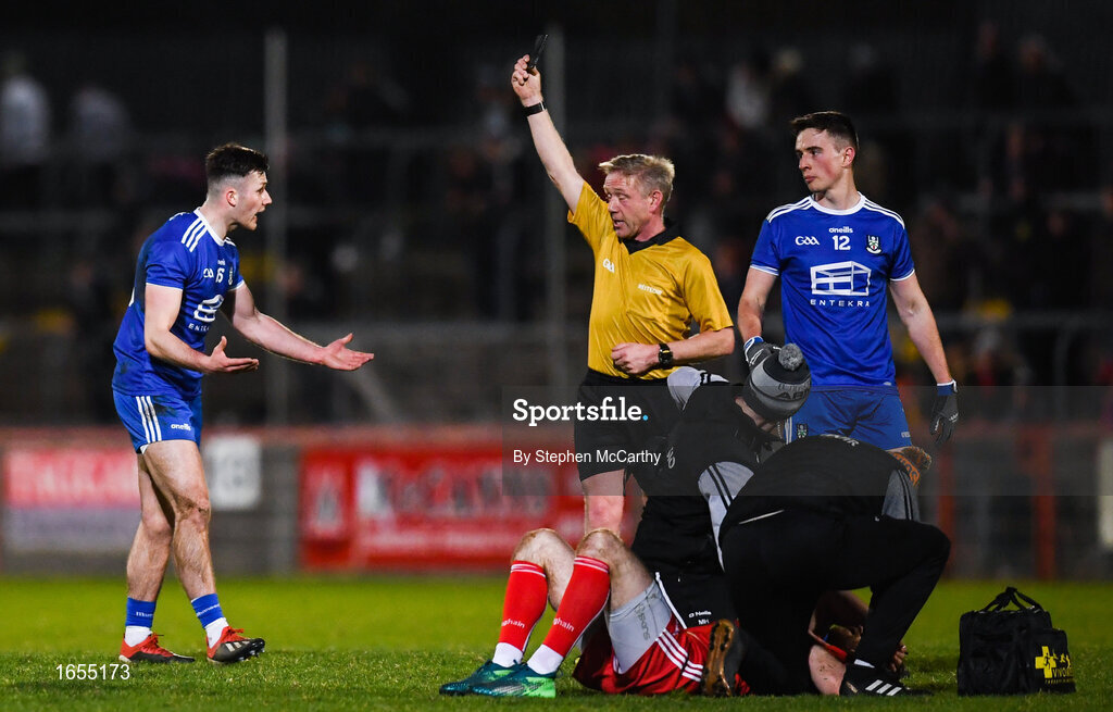 23 February 2019; Dessie Ward of Monaghan receives a black card from referee Ciaran Branagan for a tackle on Ronan McNamee of Tyrone during the Allianz Football League Division 1 Round 4 match between Tyrone and Monaghan at Healy Park in Omagh, Co Tyrone. Photo by Stephen McCarthy/Sportsfile