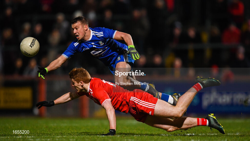 23 February 2019; Ryan Wylie of Monaghan in action against Peter Harte of Tyrone during the Allianz Football League Division 1 Round 4 match between Tyrone and Monaghan at Healy Park in Omagh, Co Tyrone. Photo by Stephen McCarthy/Sportsfile
