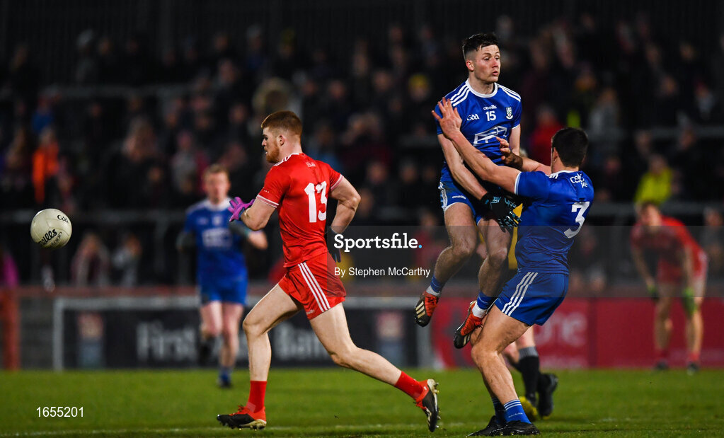 23 February 2019; Cathal McShane of Tyrone in action against Dermot Malone and Drew Wylie, 3, of Monaghan during the Allianz Football League Division 1 Round 4 match between Tyrone and Monaghan at Healy Park in Omagh, Co Tyrone. Photo by Stephen McCarthy/Sportsfile