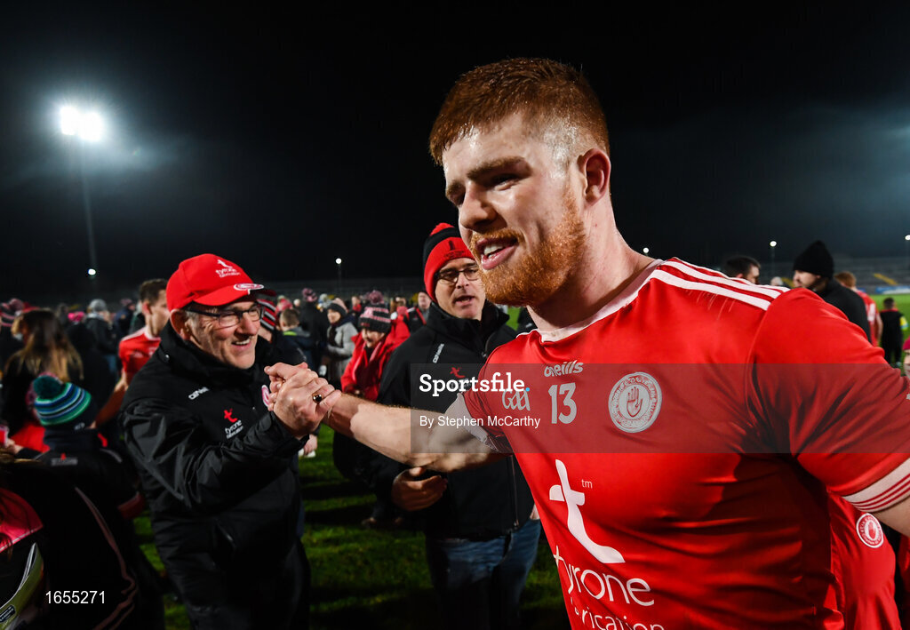 23 February 2019; Tyrone manager Mickey Harte and Cathal McShane following the Allianz Football League Division 1 Round 4 match between Tyrone and Monaghan at Healy Park in Omagh, Co Tyrone. Photo by Stephen McCarthy/Sportsfile