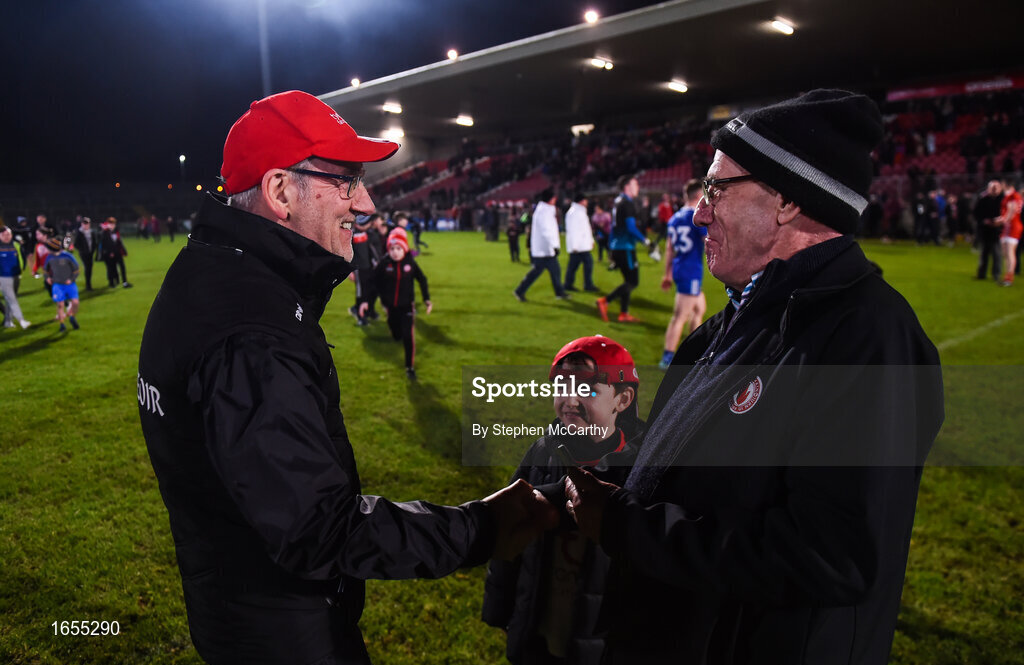 23 February 2019; Tyrone manager Mickey Harte is congratulated by Charlie McKeown and his grandson Michael Doran, age 7, following the Allianz Football League Division 1 Round 4 match between Tyrone and Monaghan at Healy Park in Omagh, Co Tyrone. Photo by Stephen McCarthy/Sportsfile