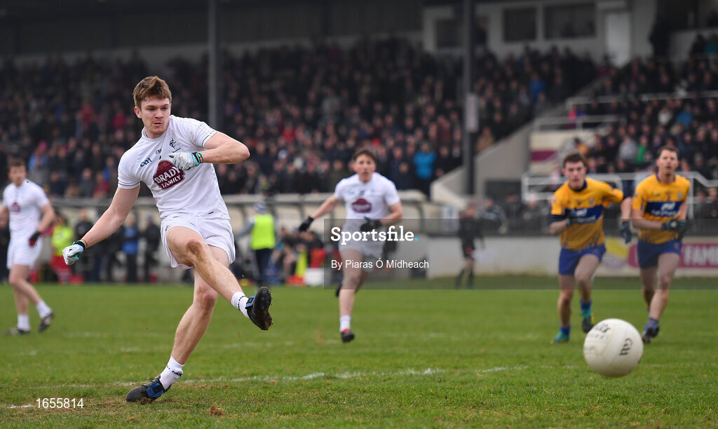 24 February 2019; Kevin Feely of Kildare scores his side's first goal, from a penalty, during the Allianz Football League Division 2 Round 4 match between Kildare and Clare at St Conleth's Park in Newbridge, Co Kildare. Photo by Piaras Ó Mídheach/Sportsfile
