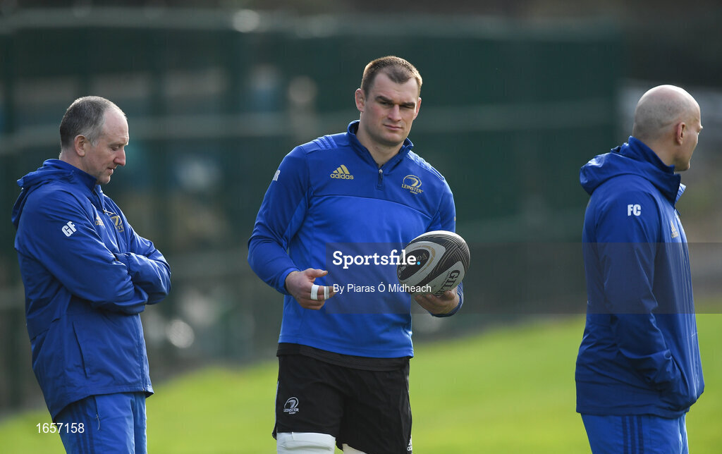 18 February 2019; Rhys Ruddock, centre, with Garreth Farrell, Head Physiotherapist, left, and Backs coach Felipe Contepomi during Leinster Rugby Squad Training at Rosemount in UCD, Dublin. Photo by Piaras Ó Mídheach/Sportsfile