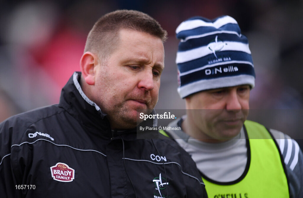 24 February 2019; Kildare manager Cian O'Neill, left, and head coach Alan Flynn at half-time during the Allianz Football League Division 2 Round 4 match between Kildare and Clare at St Conleth's Park in Newbridge, Co Kildare. Photo by Piaras Ó Mídheach/Sportsfile