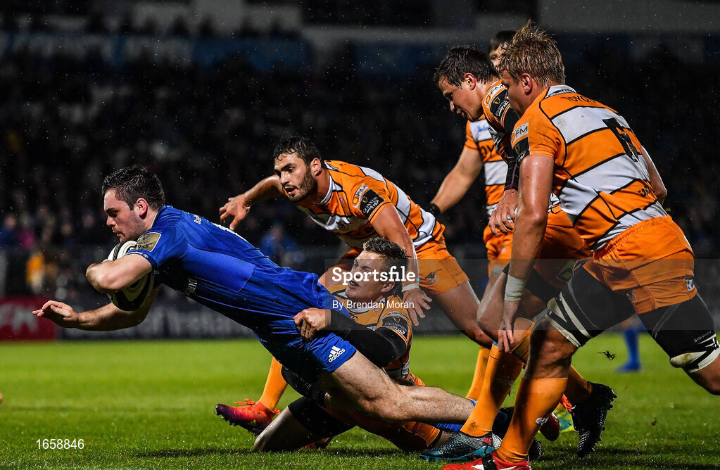 1 March 2019; Conor O’Brien of Leinster scores his side's first try during the Guinness PRO14 Round 17 match between Leinster and Toyota Cheetahs at the RDS Arena in Dublin. Photo by Brendan Moran/Sportsfile