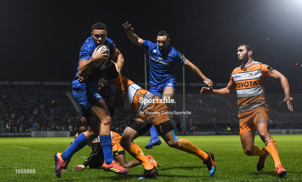 1 March 2019; Adam Byrne of Leinster is tackled by Louis Fouche of Toyota Cheetahs on his way to scoring his side's second try during the Guinness PRO14 Round 17 match between Leinster and Toyota Cheetahs at the RDS Arena in Dublin. Photo by Ramsey Cardy/Sportsfile