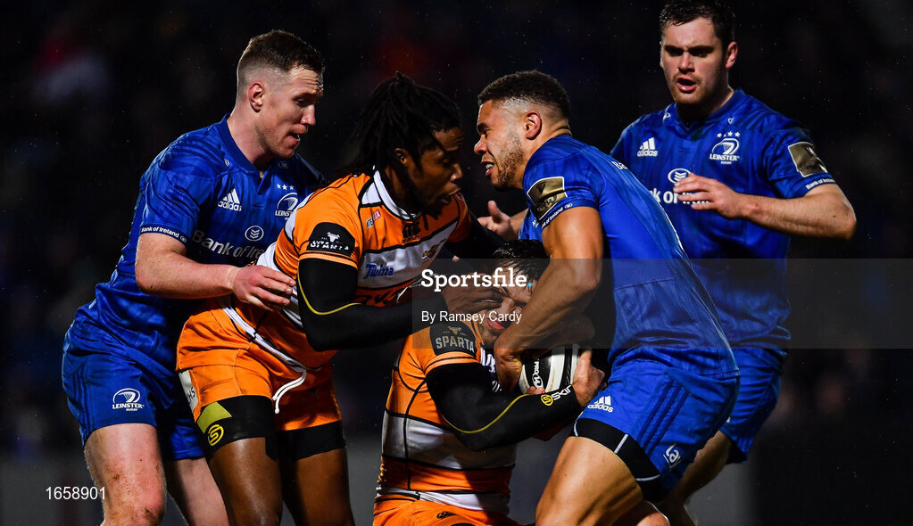 1 March 2019; Louis Fouche is tackled by Adam Byrne of Leinster during the Guinness PRO14 Round 17 match between Leinster and Toyota Cheetahs at the RDS Arena in Dublin. Photo by Ramsey Cardy/Sportsfile