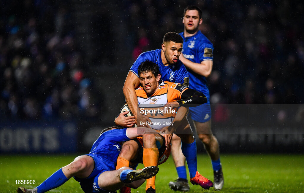 1 March 2019; Louis Fouche is tackled by Rory O'Loughlin, left, and Adam Byrne of Leinster during the Guinness PRO14 Round 17 match between Leinster and Toyota Cheetahs at the RDS Arena in Dublin. Photo by Ramsey Cardy/Sportsfile