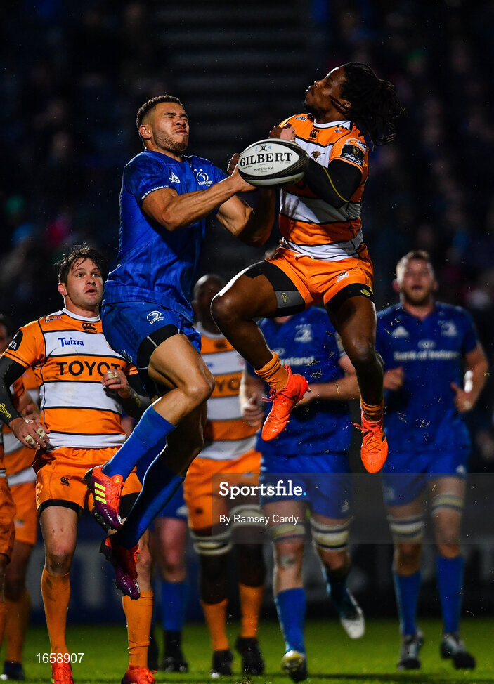 1 March 2019; Rabz Maxwane of Toyota Cheetahs and Adam Byrne of Leinster contest a high ball during the Guinness PRO14 Round 17 match between Leinster and Toyota Cheetahs at the RDS Arena in Dublin. Photo by Ramsey Cardy/Sportsfile