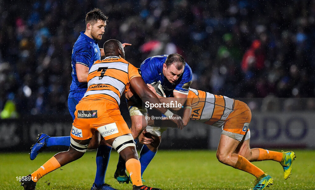 1 March 2019; Rhys Ruddock of Leinster is tackled by Abongile Nonkontwana, left, and Benhard Janse van Rensburg of Toyota Cheetahs during the Guinness PRO14 Round 17 match between Leinster and Toyota Cheetahs at the RDS Arena in Dublin. Photo by Brendan Moran/Sportsfile