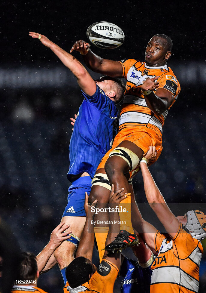 1 March 2019; Abongile Nonkontwana of Toyota Cheetahs wins possession in a lineout ahead of Ross Molony of Leinster during the Guinness PRO14 Round 17 match between Leinster and Toyota Cheetahs at the RDS Arena in Dublin. Photo by Brendan Moran/Sportsfile