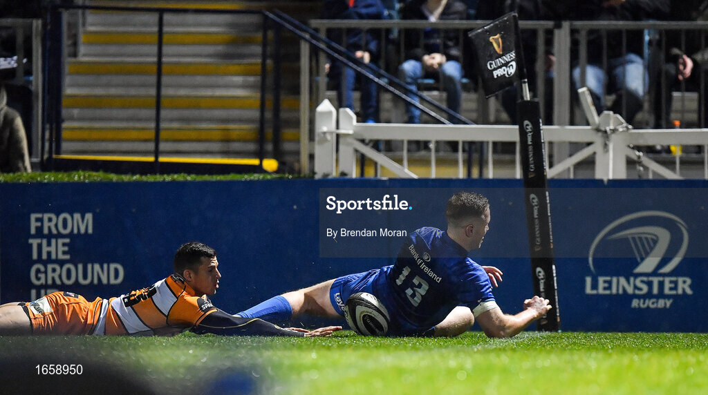1 March 2019; Rory O’Loughlin of Leinster scores his side's third try during the Guinness PRO14 Round 17 match between Leinster and Toyota Cheetahs at the RDS Arena in Dublin. Photo by Brendan Moran/Sportsfile