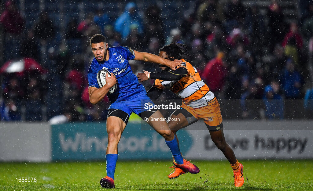 1 March 2019; Adam Byrne of Leinster is tackled by Rabz Maxwane of Toyota Cheetahs during the Guinness PRO14 Round 17 match between Leinster and Toyota Cheetahs at the RDS Arena in Dublin. Photo by Brendan Moran/Sportsfile