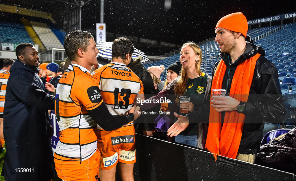 1 March 2019; Tian Schoeman of Toyota Cheetahs meets supporters after after the Guinness PRO14 Round 17 match between Leinster and Toyota Cheetahs at the RDS Arena in Dublin. Photo by Brendan Moran/Sportsfile