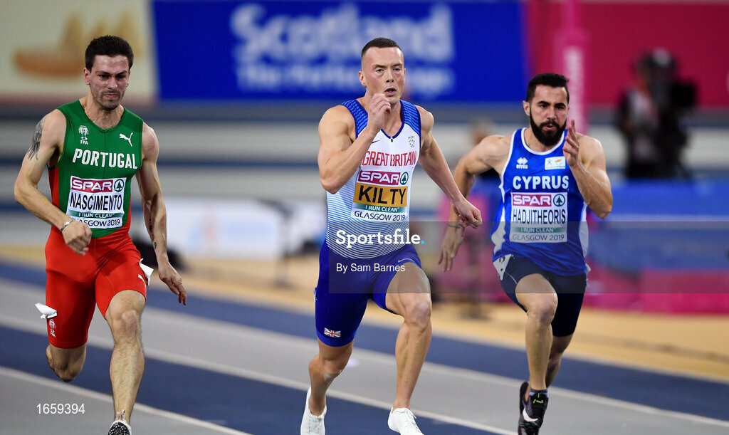 2 March 2019; Richard Kilty of Great Britain, centre, competing in the Men's 60m heats during day two of the European Indoor Athletics Championships at Emirates Arena in Glasgow, Scotland. Photo by Sam Barnes/Sportsfile