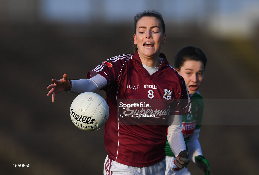 2 March 2019; Áine McDonagh of Galway in action against Róisín Durkin of Mayo during the Lidl Ladies NFL Division 1 Round 4 match between Mayo and Galway at Elverys MacHale Park in Castlebar, Mayo. Photo by Piaras Ó Mídheach/Sportsfile