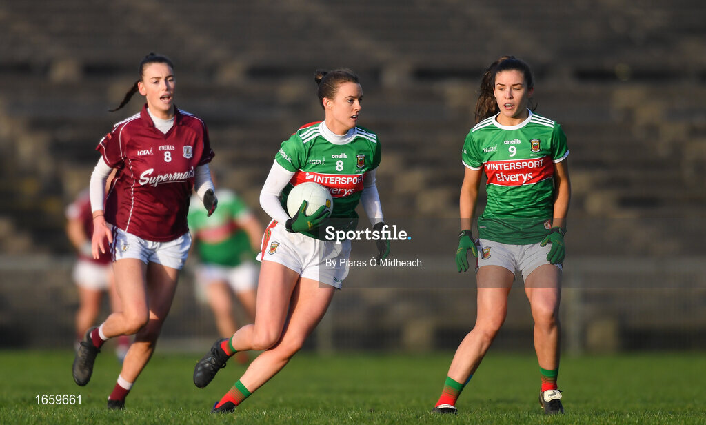 2 March 2019; Clodagh McManamon of Mayo, supported by team-mate Dayna Finn gets past Áine McDonagh of Galway during the Lidl Ladies NFL Division 1 Round 4 match between Mayo and Galway at Elverys MacHale Park in Castlebar, Mayo. Photo by Piaras Ó Mídheach/Sportsfile