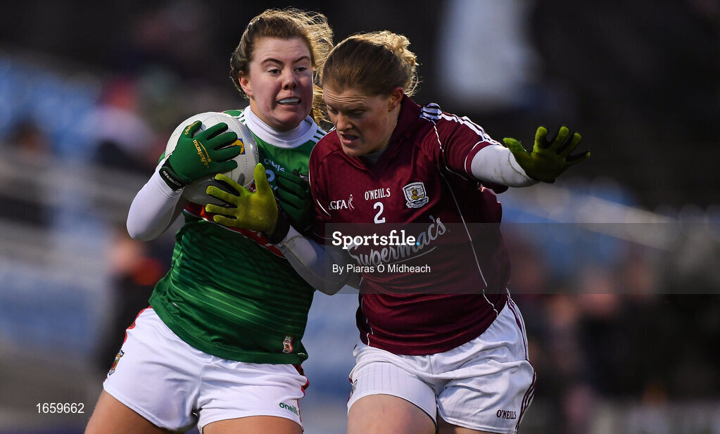 2 March 2019; Natasha Gaughan of Mayo in action against Mairéad Coyne of Galway during the Lidl Ladies NFL Division 1 Round 4 match between Mayo and Galway at Elverys MacHale Park in Castlebar, Mayo. Photo by Piaras Ó Mídheach/Sportsfile
