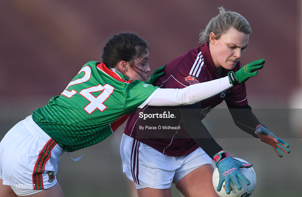 2 March 2019; Barbara Hannon of Galway in action against Róisín Durkin of Mayo during the Lidl Ladies NFL Division 1 Round 4 match between Mayo and Galway at Elverys MacHale Park in Castlebar, Mayo. Photo by Piaras Ó Mídheach/Sportsfile
