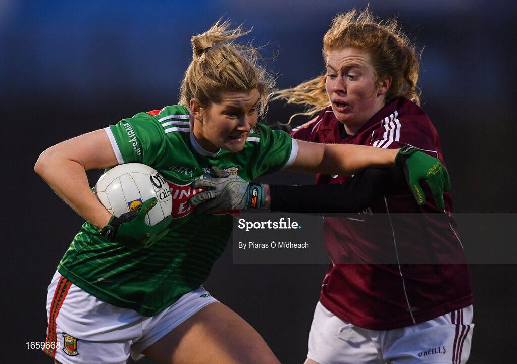2 March 2019; Grace Kelly of Mayo in action against Louise Ward of Galway during the Lidl Ladies NFL Division 1 Round 4 match between Mayo and Galway at Elverys MacHale Park in Castlebar, Mayo. Photo by Piaras Ó Mídheach/Sportsfile