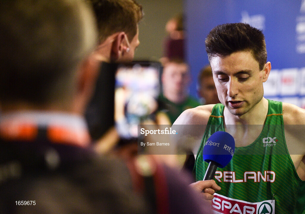2 March 2019; Mark English of Ireland speaks to members of the media following of final of the Men's 800m event during day two of the European Indoor Athletics Championships at Emirates Arena in Glasgow, Scotland. Photo by Sam Barnes/Sportsfile