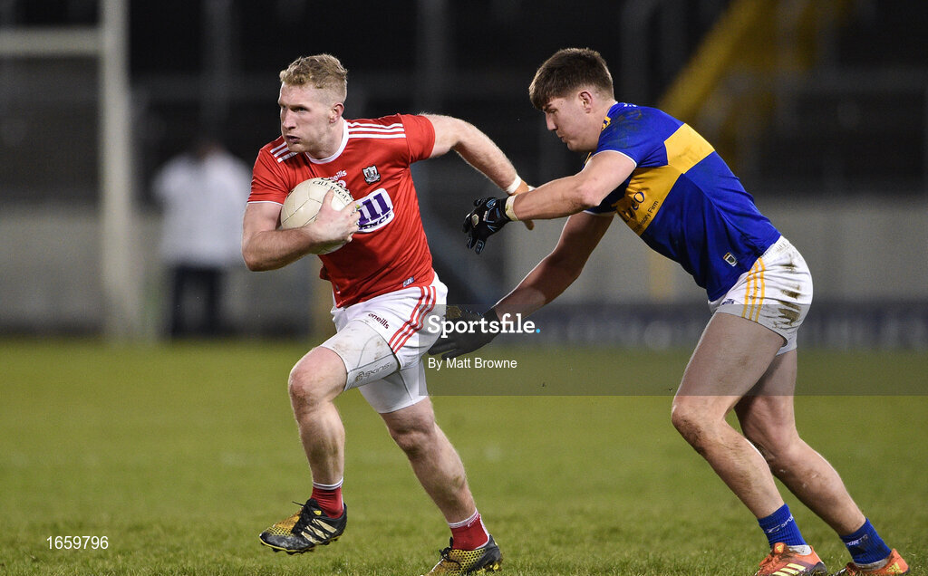 2 March 2019; Ruairi Deane of Cork in action against Steven O'Brien of Tipperary during the Allianz Football League Division 2 Round 5 match between Tipperary and Cork at Semple Stadium in Thurles, Tipperary. Photo by Matt Browne/Sportsfile