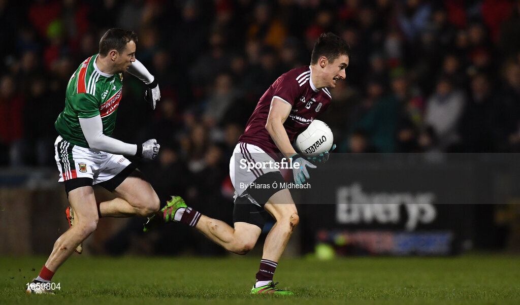 2 March 2019; Antaine Ó Laoí of Galway gets away from Keith Higgins of Mayo during the Allianz Football League Division 1 Round 5 match between Mayo and Galway at Elverys MacHale Park in Castlebar, Mayo. Photo by Piaras Ó Mídheach/Sportsfile