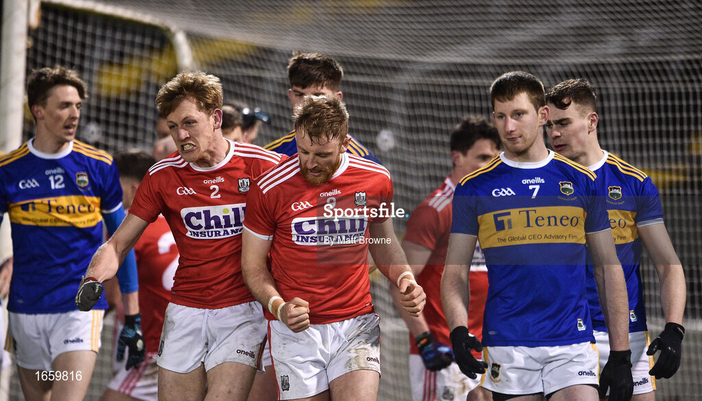 2 March 2019; Sam Ryan, left, and Cillian O'Hanlon of Cork celebrate after the Allianz Football League Division 2 Round 5 match between Tipperary and Cork at Semple Stadium in Thurles, Tipperary. Photo by Matt Browne/Sportsfile