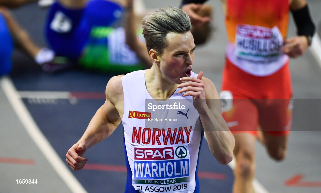 2 March 2019; Karsten Warholm of Norway after winning the Men's 400m event during day two of the European Indoor Athletics Championships at Emirates Arena in Glasgow, Scotland. Photo by Sam Barnes/Sportsfile