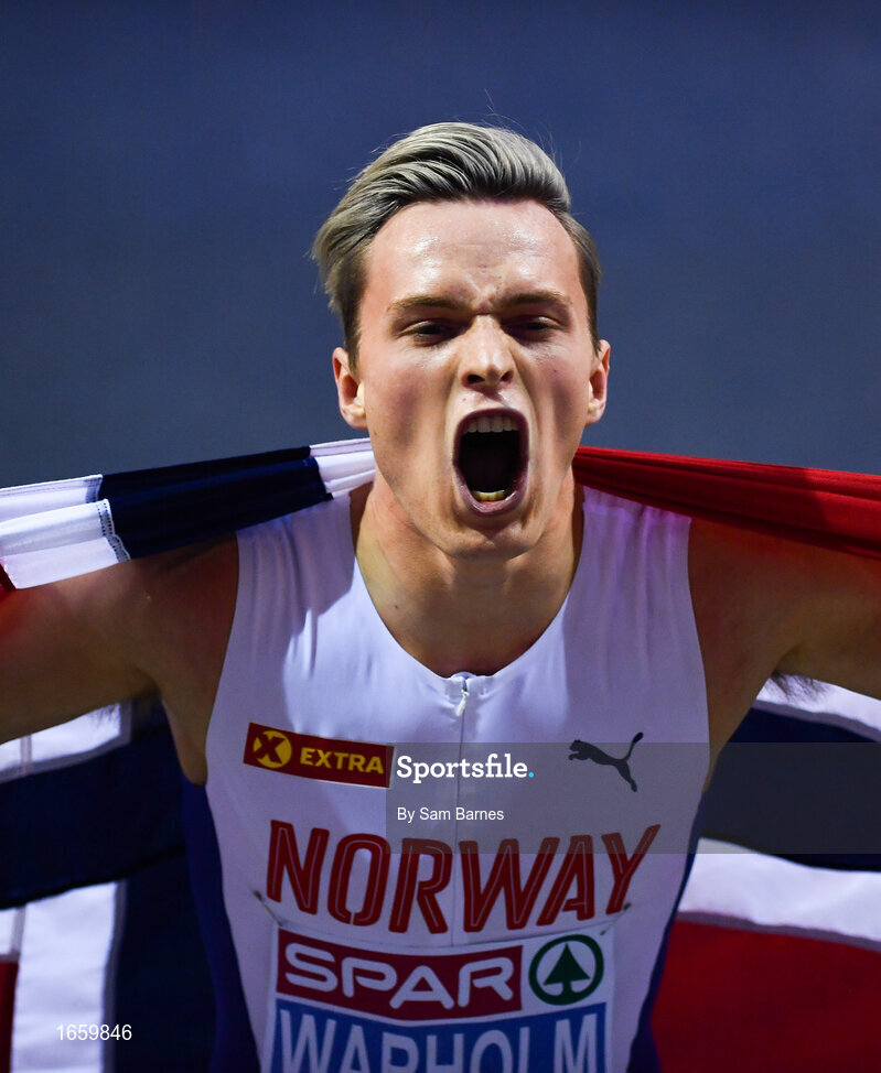 2 March 2019; Karsten Warholm of Norway after winning the Men's 400m event during day two of the European Indoor Athletics Championships at Emirates Arena in Glasgow, Scotland. Photo by Sam Barnes/Sportsfile