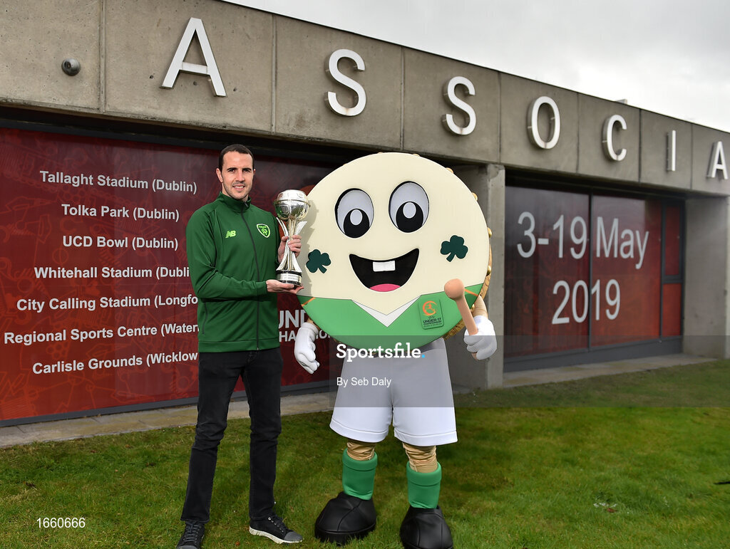 4 March 2019; Former Republic of Ireland international John O'Shea was today named as the Tournament Ambassador for the upcoming UEFA Under-17 European Championship. The tournament, which takes places from May 3rd to May 19th, will see matches held in Dublin, Longford and Waterford, with the final at Tallaght Stadium. Pictured is former Republic of Ireland international John O'Shea, with tournament mascot Barry The Bodhran at the FAI Headquarters in Abbotstown, Dublin. Photo by Seb Daly/Sportsfile