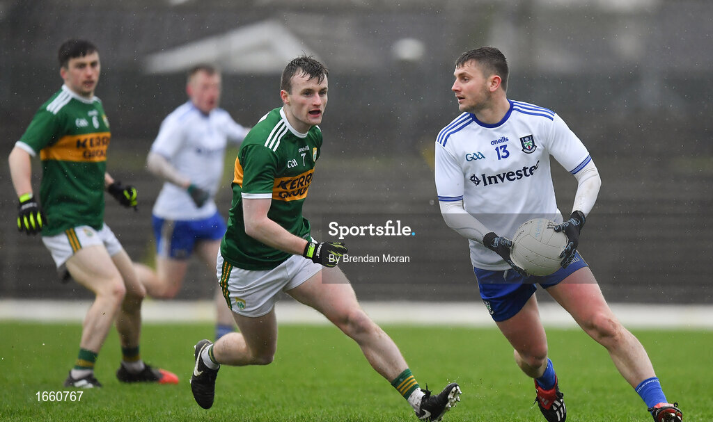 3 March 2019; Dermot Malone of Monaghan in action against Tom O'Sullivan of Kerry during the Allianz Football League Division 1 Round 5 match between Kerry and Monaghan at Fitzgerald Stadium in Killarney, Kerry. Photo by Brendan Moran/Sportsfile
