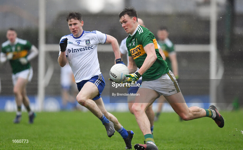 3 March 2019; Gavin O'Brien of Kerry in action against Karl O'Connell of Monaghan during the Allianz Football League Division 1 Round 5 match between Kerry and Monaghan at Fitzgerald Stadium in Killarney, Kerry. Photo by Brendan Moran/Sportsfile